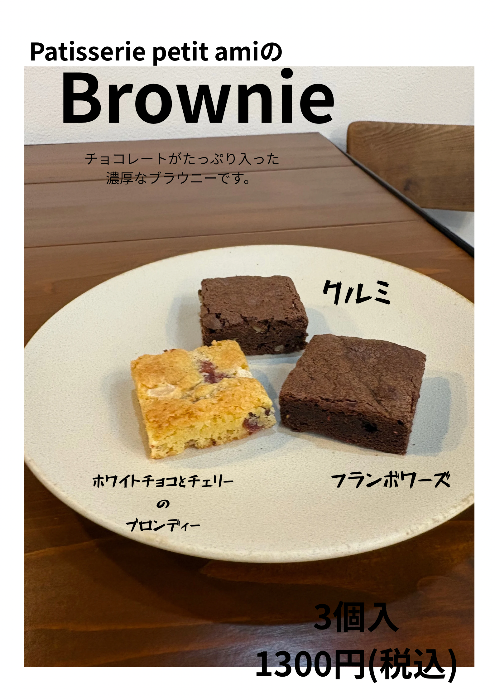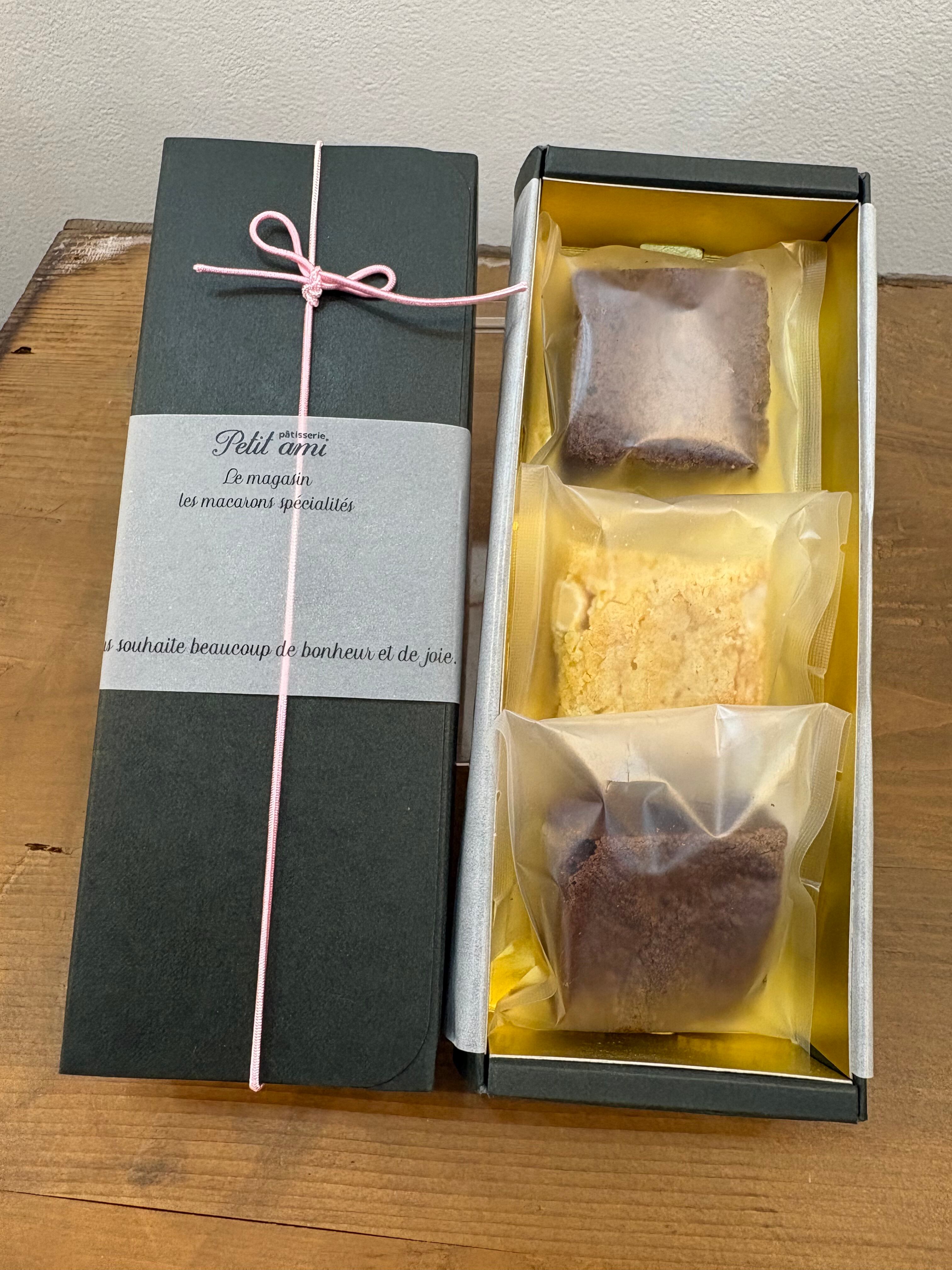 チョコレートがたっぷり入った濃厚なブラウニーです。3種類の味が入っています。