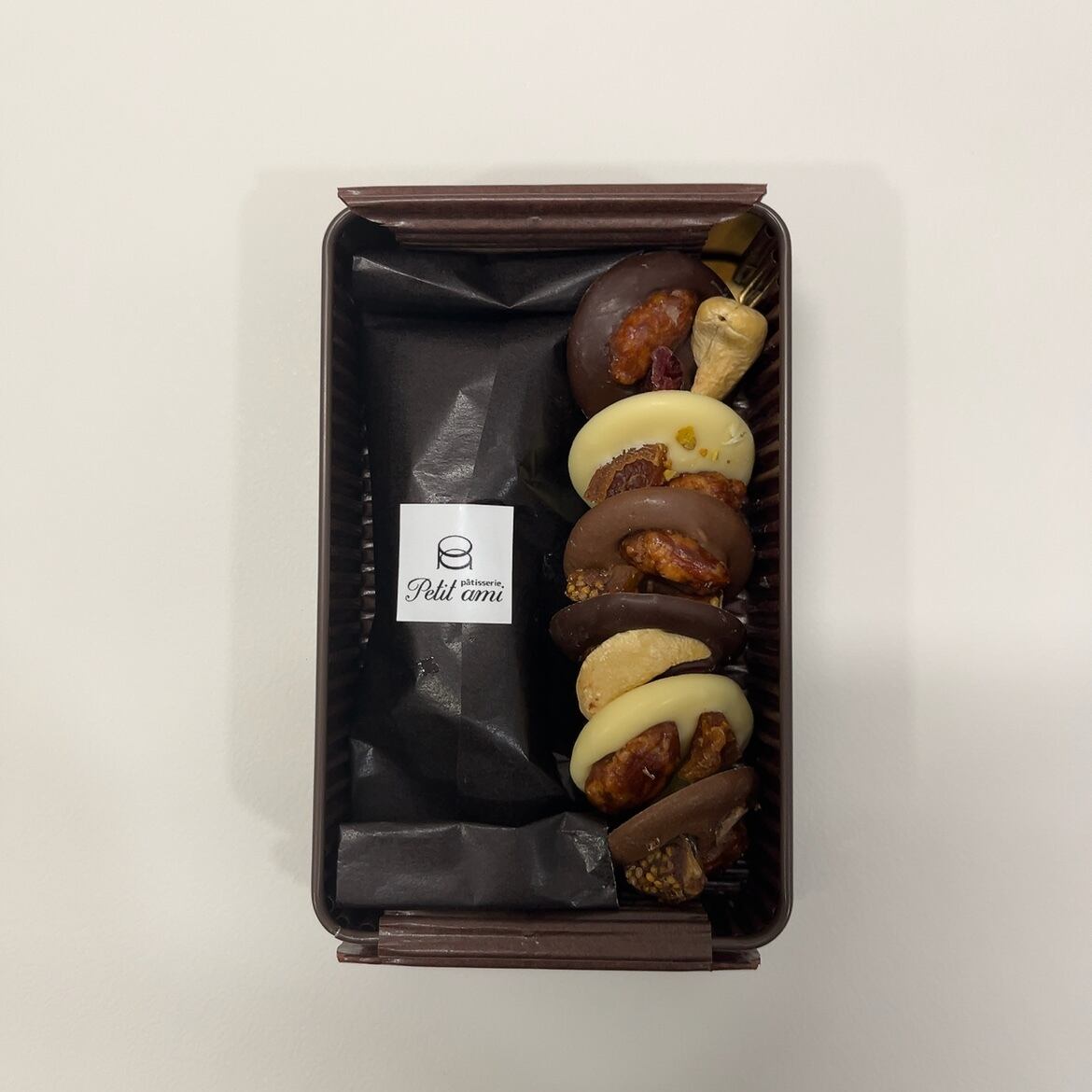 マンディアンは、スイート、ミルクホワイトチョコの3種類。ナッツやドライフルーツの種類も変えています。